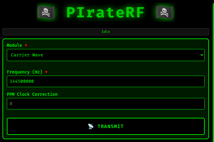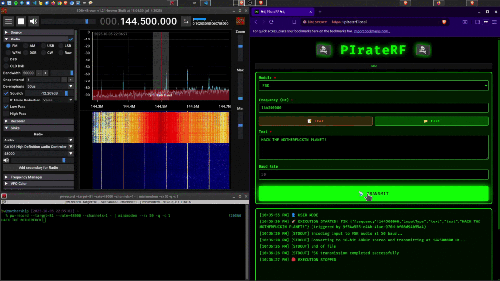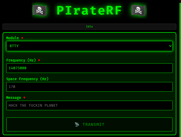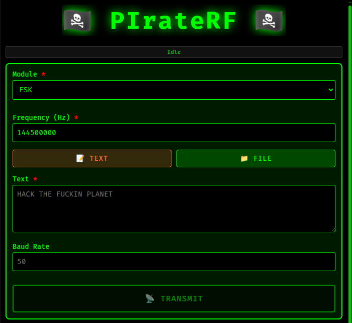 Binary frequency shift keying for data transmission. You can send text directly or upload data files (any format – they’re sent as-is). Configure your frequency and baud rate (50-100 baud works best based on testing), and PIrateRF handles the rest.