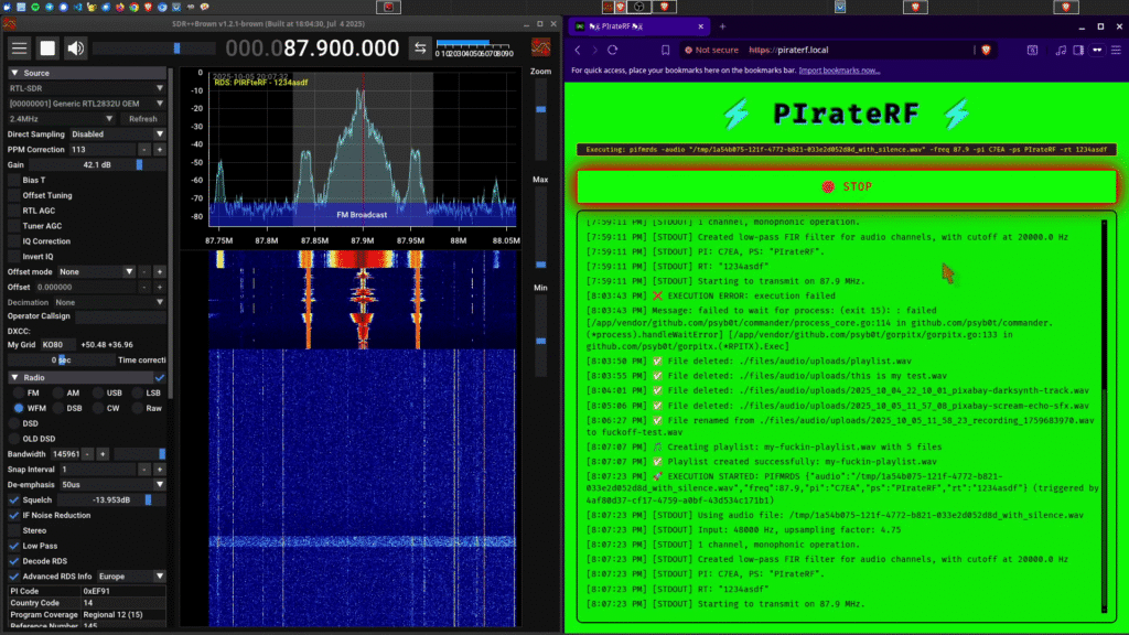 When you tune into the transmission with an SDR receiver, you see three signals: the main carrier with your audio, and two parallel RDS subcarriers containing your station metadata. SDR++ (the sdrpp-brown fork) has built-in RDS decoding, so you can verify your station name and text are transmitting properly.