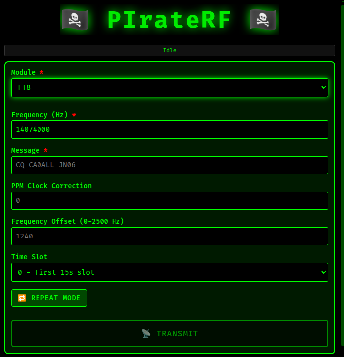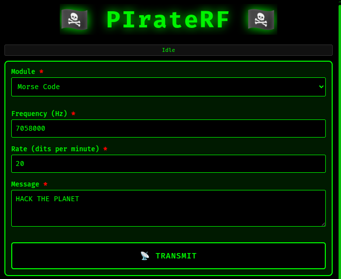 PIrateRF wraps rpitx in a Go service that spawns its own WiFi access point and serves a web interface. Boot up the Pi, connect to its hotspot from any device (phone, laptop, tablet), open a browser, and you get a clean interface with all 11 transmission modes ready to go. Select your mode, configure your settings, upload your files if needed, and hit transmit. That’s it.