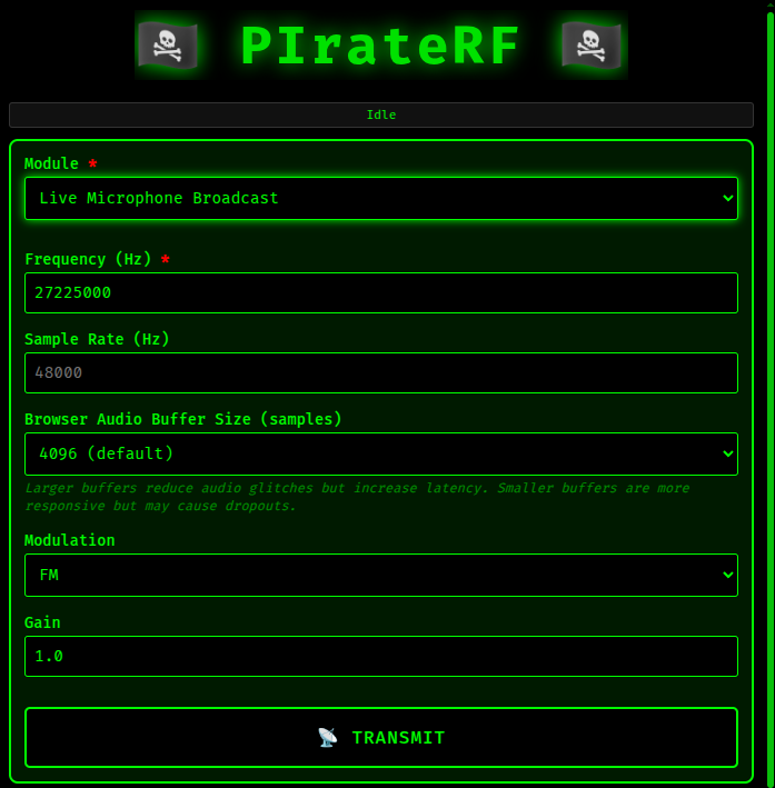 This mode streams your microphone directly to RF in real-time. The browser captures audio, sends it via WebSocket to the Pi, and pipes it straight into rpitx for transmission. You can configure modulation type (AM/DSB/USB/LSB/FM/RAW), sample rate, buffer size (trading latency for quality), and gain.