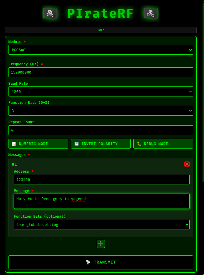 Remember pagers from the 90s? PIrateRF brings that nostalgia back. POCSAG supports multiple messages, each with its own pager address and text. You configure baud rate (512/1200/2400), function bits (0 for numeric, 3 for alphanumeric, 1-2 for ring-only), repeat count, and optional features like numeric mode, polarity inversion, and debug output.