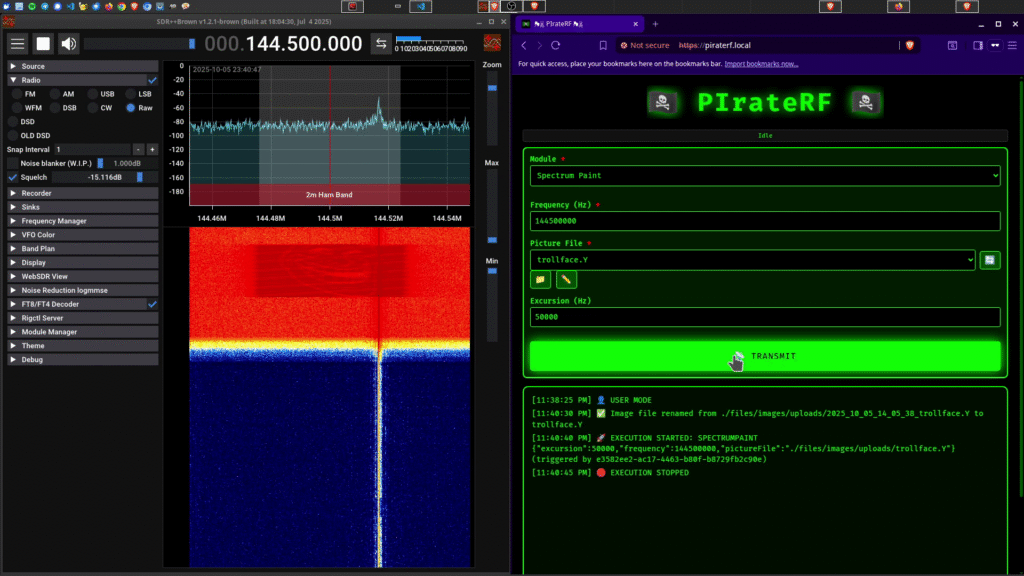 Full disclosure: I’ve tried decoding this with QSSTV and haven’t successfully received images yet. The rpitx SSTV module is trusted to generate proper Martin 1 signals, but I can’t personally confirm it works. If you successfully decode SSTV from PIrateRF, please open a PR with your setup details.