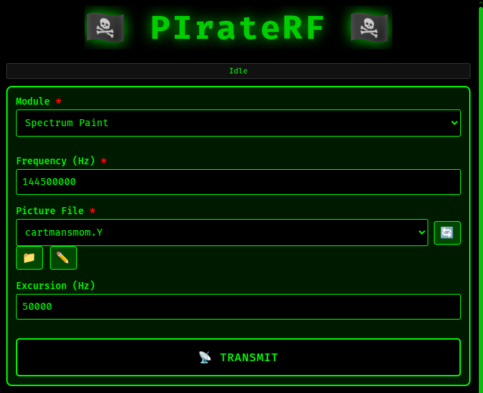 Turn images into RF spectrum art. Upload an image and PIrateRF converts it to YUV format for spectrum painting (also generates RGB format for SSTV compatibility). Configure your base frequency and excursion (frequency deviation, default 100 kHz).