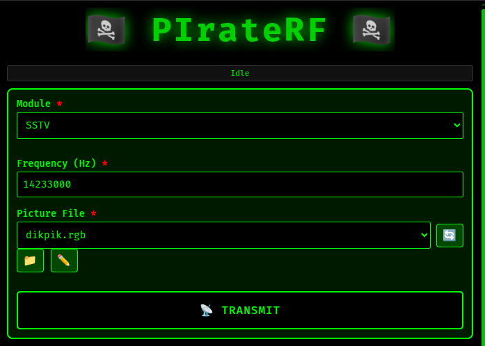 Upload images for SSTV transmission using Martin 1 mode. PIrateRF converts uploaded images (JPEG/PNG/GIF) to the proper RGB 320×256 format automatically.